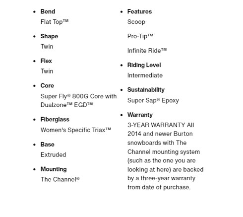 From unexplored peaks to your favorite parks, the women's Burton Yeasayer Snowboard tames anything that stands in your way. The board's Flat Top bend surfs through deep powder while keeping things stable underfoot, and a true twin design keeps you in control no matter which way you point it. A laundry list of features all work together to ensure that the ride is as friendly as it is fun, with an energetic core and a scoop tip and tail, which turn up the edges for a catch-free feel whether you're surfing through knee deep pow or sliding a box in the park.