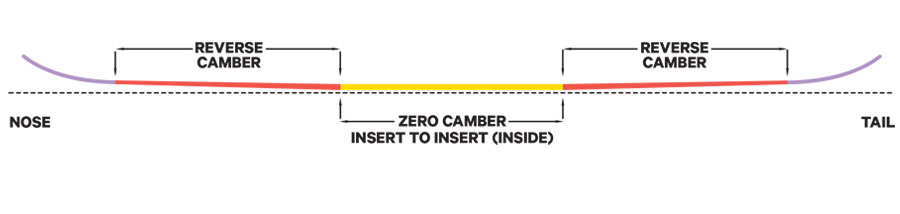 The ALPINE V3 profile has a deeper traditional camber that zeros out before the end of the sidecut. The small zero camber sections provide a more controlled ride while retaining the response and power of a throwback cambered board.