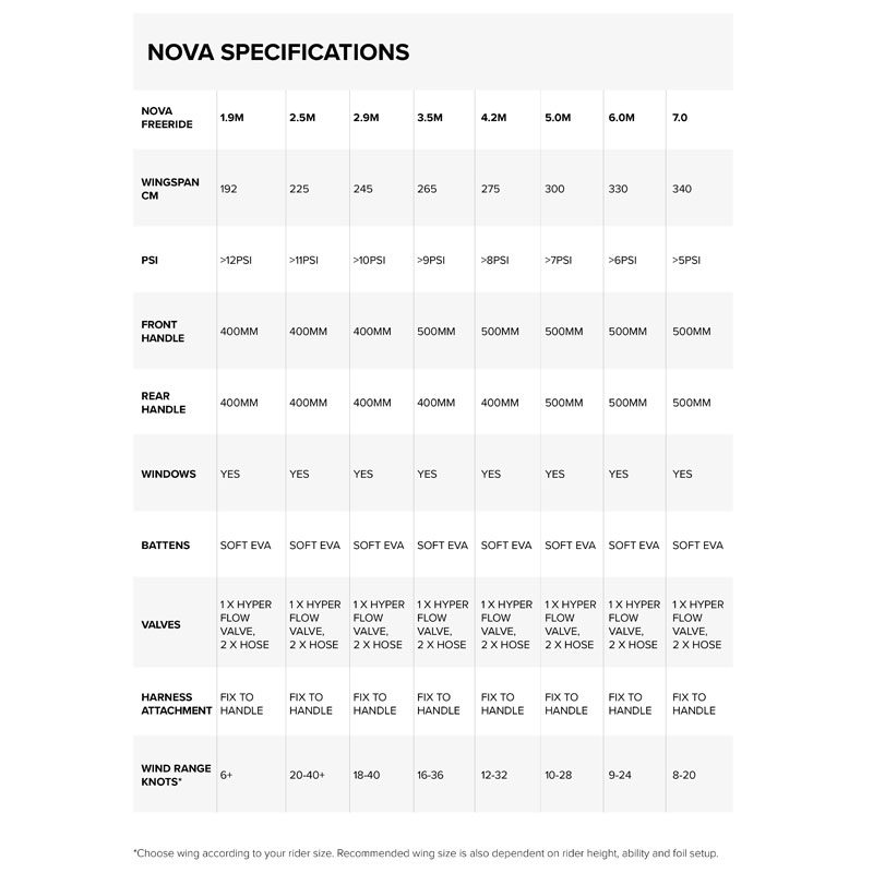 Balanced and reactive, the new Nova Wing feels lighter in your hands. It generates more forward drive and upwind performance than anything you’ve ever ridden. At the heart of the Nova design is a super-stiff frame for power and efficiency, enabling instant take-offs and a massive wind range. Intuitive transitions. Comfortable ergonomic handling. For 2022 the Nova has a revised compact outline with shorter wingspan and less curve. This improves the power delivery, makes the wing easier to handle and reduces tip-strike. Improved tensioning and a deeper, more powerful profile boost low-end performance and contribute to the expanded wind range. Power delivery is progressive throughout the size range, with smooth and steady high-end stability in the 5m and under. The new rigid handle design with comfort grip enables more intuitive hand positioning, micro-trimming and more immediate control. Whether your focus is on the flow of freeride carving, riding open ocean waves or freestyle trickery, the Nova Wing will help you make the most your local conditions. Load up. Ride longer.